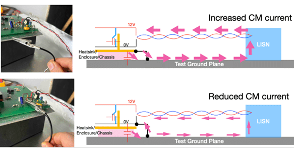 To demonstrate this, we set up a simple test arrangement and illustrate the common-mode current paths for two different configurations, as shown in Figure 4.